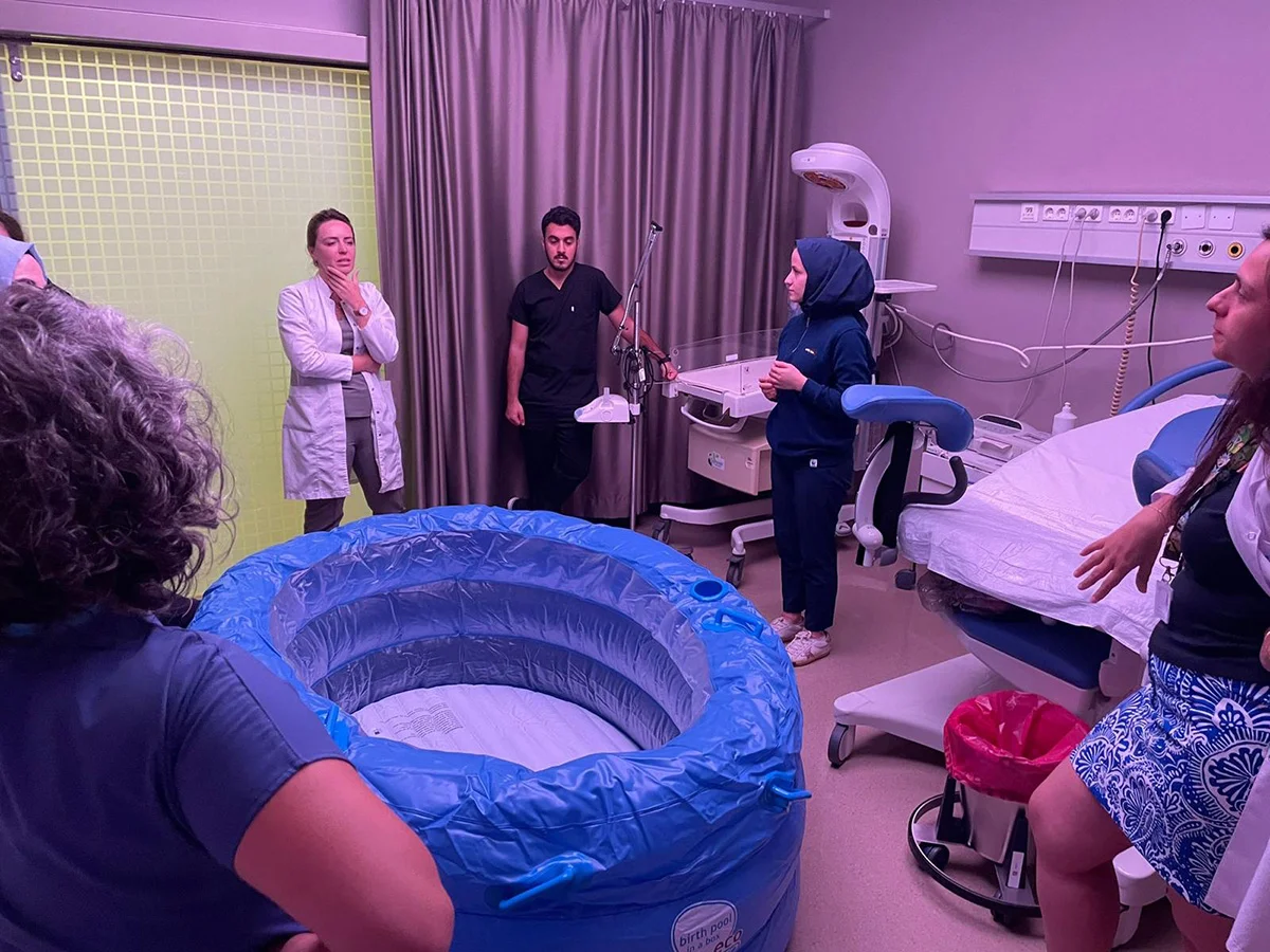 Liv Ulus Hospital’da kadın doğum doktorları, kadın doğum hemşireleri, doğumhane sorumlu ebesi, biyomedikal ekibi, enfeksiyon birimi sorumlusunun katıldığı suda doğum havuzu kullanıcı eğitimi gerçekleşti. Ürün ve Pazarlama Mühendisi Büşra Öztürk; havuzu hazırlama, doldurma ve boşaltma, temizleme konularında bilgilendirme yaptı.