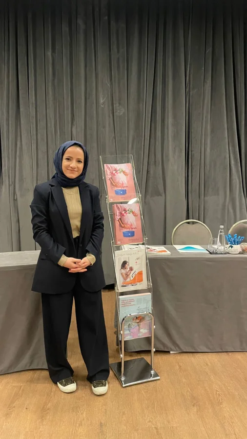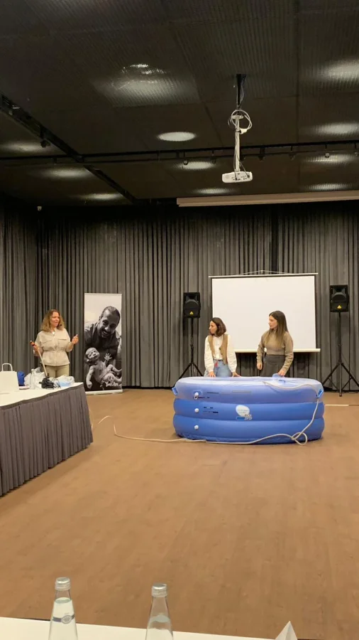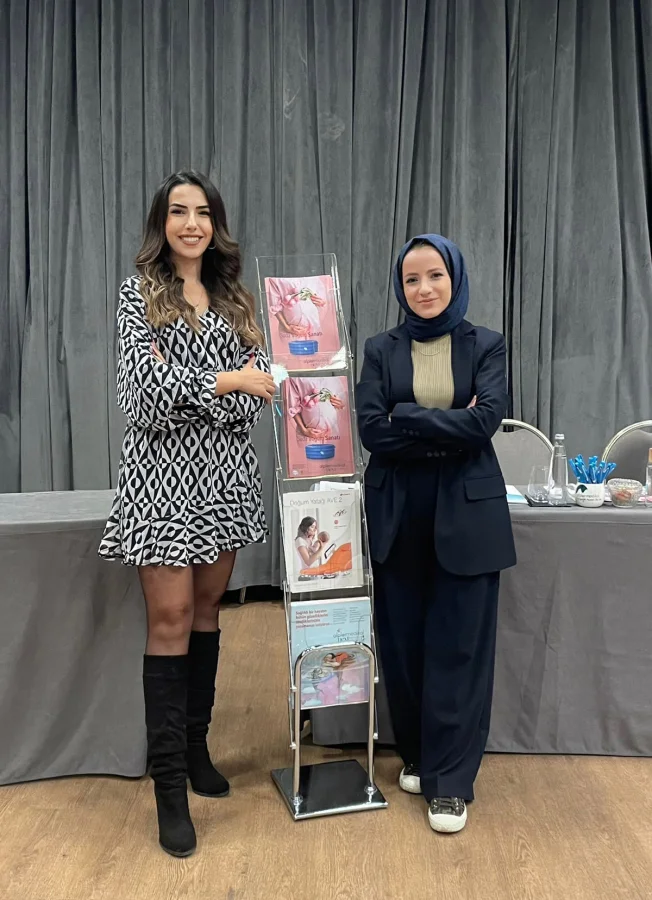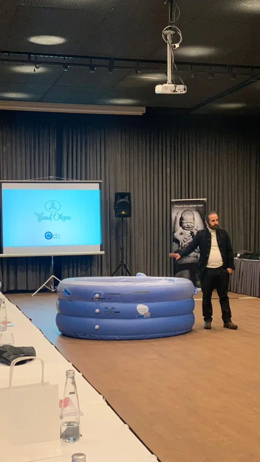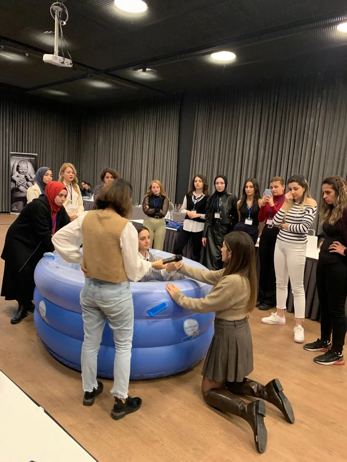 Alpler Medikal Satış Sorumlusu Zehra Cankurt ve Ürün ve Pazarlama Mühendisi Büşra Öztürk de suda doğum havuzunun teknik özellik ve tedarik süreci konularında soruları yanıtlamak üzere eğitimde yer aldı.